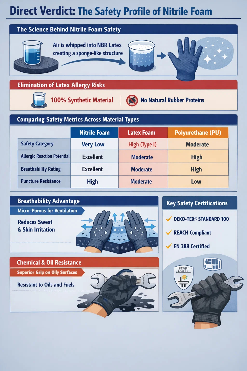 Endüstriyel el korumasındaki en büyük güvenlik engellerinden biri Tip I lateks alerjilerinin yaygınlığı olmuştur. nitril eldiven ve köpük kaplı çeşitleri kesin bir çözüm sunar. Petrolden türetilmiş bir akrilonitril ve bütadien kopolimerinden yapıldıkları için, ciddi bağışıklık tepkilerini tetikleyen organik proteinlerden yoksundurlar, bu da onları çeşitli iş gücünde "evrensel" kullanım için güvenli kılar.