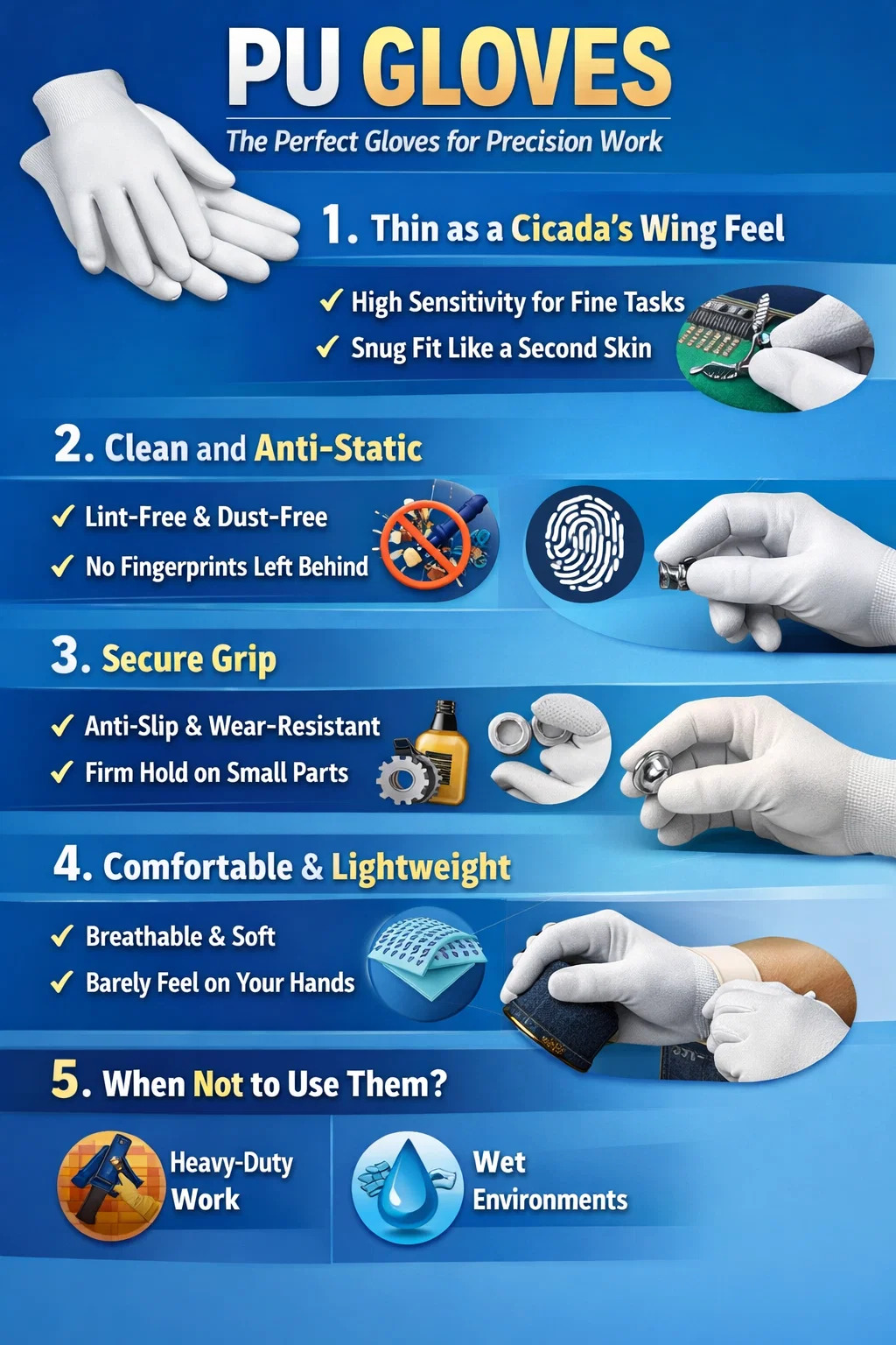 Pek çok eldiven çalışma sırasında tüy veya lastik parçaları döker, ancak PU eldivenler bunu yapmaz.
