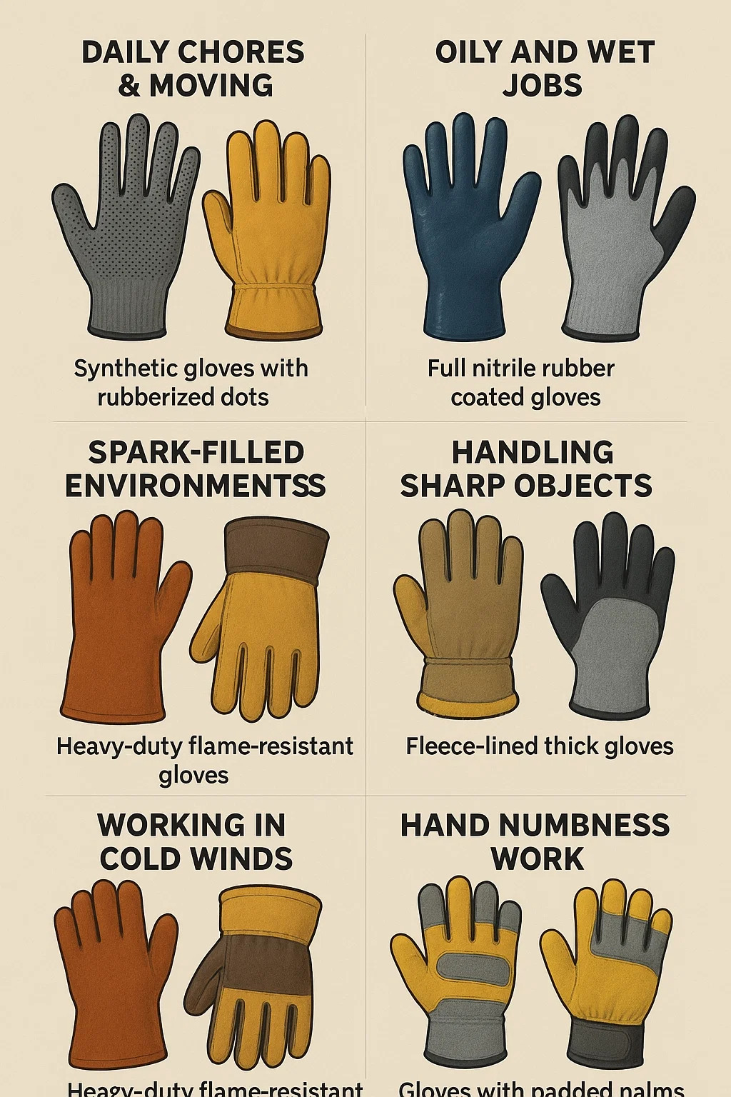 Gerçekten iyi olanı seçerken herkese uyan tek bir cevap yoktur iş eldivenleri —en iyi çift tamamen yaptığınız işe bağlıdır. Önemli olan en uygun korumayı ve işlevi bulmaktır. Yaygın senaryolar için tercih edilen türler şunlardır: