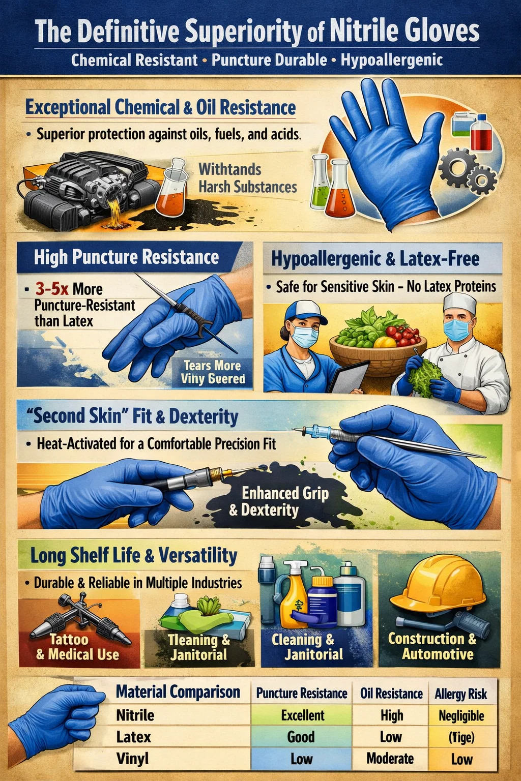 Bunu sağlayan birincil faktör nitril eldiven onlarınki özel Kimyasal direncin, delinmeye karşı dayanıklılığın ve hipoalerjenik özelliklerin eşsiz kombinasyonu lateks veya vinil alternatifleriyle karşılaştırıldığında. Doğal kauçuğun aksine nitril, petrol bazlı ürünlere, yağlara ve asitlere karşı sağlam bir bariyer sağlayan sentetik bir kopolimerdir ve bu da onu otomotiv, tıbbi ve endüstriyel uygulamalar için endüstri standardı haline getirir.